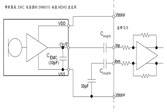 英飛凌麥克風SMM310內含兩塊芯片:MEMS芯片和ASIC芯片。兩顆芯片被封裝在一個表面貼裝器件中。MEMS芯片包括一個剛性穿孔背電極和一片彈性硅膜。MEMS芯片的用作電容,將聲壓轉換為電容變化。ASIC芯片用于檢測MEMS電容變化,并將其轉換為電信號,傳遞給相關處理器件,如基帶處理器或放大器等。ASIC 芯片是標準的IC技術。因此,這種雙芯片式方法能夠快速向ASIC增添額外功能。這種功能既可以是額外構件,如音頻信號處理、RF屏蔽,也可以是任何可以集成在標準IC上的功能。