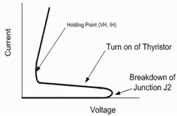 晶閘管的過壓保護設備是基于一對雙極性晶體管,這一對雙極性晶體管是由四層不同摻雜的N,P極組成,如圖1所示。N型摻雜的N1,P型摻雜的P1,和N型摻雜的N2分別構成NPN晶體管的發射極,基極和收集極,而P型摻雜的P2,N型摻雜的N2,和P型摻雜的P1分別構成了PNP晶體管的發射極,基極,和收集極。這樣一來一個晶體管的收集極是另外一個晶體管的基極。按這種方法那么一個晶體管的發射極到收集極流過的電流就是流向另一個晶體管的基極的電流。如果加一個從陽極到陰極的正電壓,那兩個三極管的發射極與基極之間,即J1和J3,都是正向電壓偏置。只有J2處PN結形成反向電壓偏置時才能阻礙電流流動。如果從陽極到陰極的電壓增加到大于J2處PN結的擊穿電壓,電流就開始直接流向兩個雙極性晶體管的基極。這使得兩個三極管都導通,會導致含有兩個三極管的晶閘管的電阻下降,并且晶閘管兩端的電壓也會減小。如圖2所示我們可以看到晶閘管的從陽極到陰極的正電流存在時的電壓-電流曲線。有著這樣的電壓-電流曲線特性的保護器件一定會有非常優秀的保護特性。當保護器件在觸發后,工作電壓下降時保護器件可以承受大的電流并且自身功耗很小。事實上,具有這種電壓-電流曲線特性的保護器件通常被稱為“消弧”保護器件,因為這就好比是通過把一個“金屬消弧”放置在需要保護的端口來實現保護作用的。值得注意的是只有當電流或者電壓降到閾值點以下,才能使得晶閘管回到高阻態,如圖2所示。