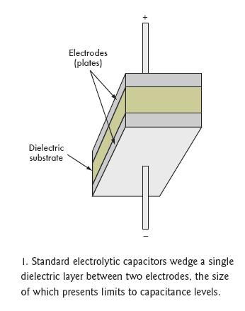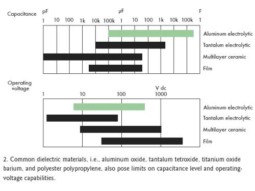 [page]標(biāo)準(zhǔn)電容的結(jié)構(gòu)是在兩個(gè)附屬于金屬板上的電極之間夾一層電介質(zhì)層(圖1)。根據(jù)電容類型不同,電介質(zhì)可以是氧化鋁、四氧化鉭、氧化鈦鋇或聚丙烯聚酯,不同的材料決定了不同的容量和電壓特性(圖2)。電介質(zhì)的多少和極板間的距離也會(huì)影響電容量。然而,極板間最大允許距離限制了電介質(zhì)的數(shù)量。