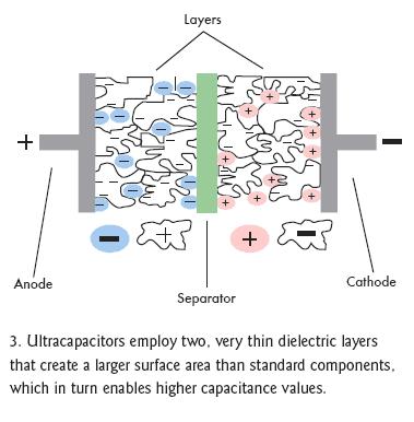 雙電層電容器(EDLC)正如它的字面意義那樣可以解決上述問題,它在相同的封裝內(nèi)增加了第二個(gè)電介層,這個(gè)電介層與第一層在中間隔離物的兩邊并行工作(圖3)。EDLC也采用無孔電介質(zhì),如活性碳、碳納米管、炭黑凝膠,并選用導(dǎo)電聚合物,其存儲(chǔ)容量要比標(biāo)準(zhǔn)的電解材料高出許多。額外層和更高效電介材料的這種組合能使電容容量提高近4個(gè)數(shù)量級(jí)。