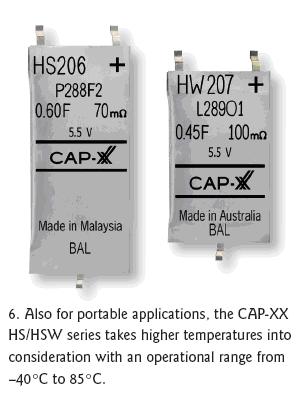同樣針對(duì)緊湊空間設(shè)計(jì)但可耐更高溫度的CAP-XX公司HS和HW系列電容器具有很薄的外殼,工作溫度范圍是-40℃到85℃(圖6)。在4.5到5.5V電壓范圍內(nèi),HW的尺寸為28.5x17mm。在5.5V電壓時(shí)的電容量可達(dá)0.4F,ESR在5.5V時(shí)可低至100mΩ。