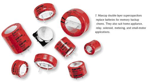 KanthalGlobar公司的Maxcap雙層電容器可以用來代替作為存儲(chǔ)器后備電源的電池,具有超過5.5F/in.3的容積效率、無限的服務(wù)壽命、快速充放電能力和非常低的漏電流等特性(圖7)。KanthalGlobar公司還表示,這些電容比電池更安全,在短路時(shí)不會(huì)爆炸,也不會(huì)損壞。這些電容器是非極化器件,不需要限流電阻或過壓保護(hù),因而可以消除裝配錯(cuò)誤和相關(guān)的成本。