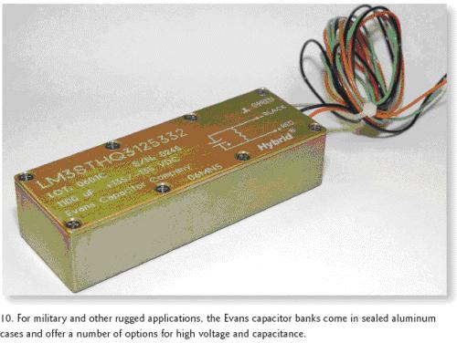 [page]EvansCapacitor公司的3STHQ3和3PTHQ3電容組器件則主要用于任務(wù)繁重的軍事應(yīng)用,它將公司的三個(gè)THQ3混合電容集成進(jìn)了一個(gè)陽極電鍍、環(huán)氧密封的鋁殼中,整個(gè)尺寸為4.47×1.59×1.09英寸(圖10)。針對(duì)更高的工作電壓,3STHQ3組可以串聯(lián)電容的方式提供以下四種產(chǎn)品:0.004F/160Vdc,0.0028F/200Vdc,0.0019F/250Vdc和0.0011F/300Vdc。