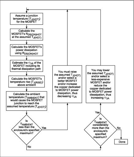 話說回來,TJ又依賴于MOSFET的功率耗散以及MOSFET的熱阻(ΘJA)。這樣,似乎很難找到一個(gè)著眼點(diǎn)。由于功率耗散的計(jì)算涉及到若干個(gè)相互依賴的因素,我們可以采用一種迭代過程獲得我們所需要的結(jié)果(圖1)。