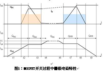 功率MOSFET管的柵極電荷特性如圖1所示,此特性圖可以在MOSFET數(shù)據(jù)表中查到,開通的工作過程可以參閱相關(guān)的文獻(xiàn)。值得注意的是:下面的開通過程對應(yīng)著BUCK變換器上管的開通狀態(tài),對于下管是0電壓開通,因此開關(guān)損耗很小,可以忽略不計。