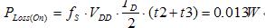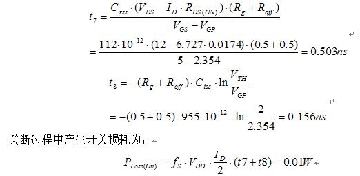 MOSFET開通損耗主要發(fā)生t2和t3時間段。下面以一個具體的實例下計算。輸入電壓12V,輸出電壓3.3V/6A,開關(guān)頻率350kHz,PWM柵極驅(qū)動器電壓為5V,導(dǎo)通電阻1.5Ohm,關(guān)斷的下拉電阻為0.5Ohm,所用的MOSFET為AO4468,具體參數(shù)如下:Ciss= 955pF,Coss= 145pF,Crss= 112pF,Rg= 0.5Ohm;當(dāng)VGS= 4.5V,Qg= 9nC;當(dāng)VGS=10V,Qg= 17nC,Qgd= 4.7nC,Qgs= 3.4nC;當(dāng)VGS=5V且ID=11.6A,跨導(dǎo)gFS= 19S;當(dāng)VDS=VGS且ID=250uA,,VTH= 2V;當(dāng)VGS= 4.5V且ID=10A,RDS(ON)=17.4mOhm。