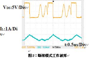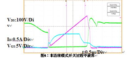 注意到圖1是基于連續(xù)電流模式下所得到的波形,對于非連續(xù)模式,由于開通前的電流為0,所以,除了Coss放電產(chǎn)生的功耗外,沒有開關(guān)的損耗,即非連續(xù)模式下開通損耗為0。但在實際的檢測中,非連續(xù)模式下仍然可以看到VGS有米勒平臺,這主要是由于Coss的放電電流產(chǎn)生的。Coss放電快,持續(xù)的時間短,這樣電流迅速降低,由于VGS和ID的受轉(zhuǎn)移特性的約束,所以當(dāng)電流突然降低時,VGS也會降低,VGS波形前沿的米勒平臺處產(chǎn)生一個下降的凹坑,并伴隨著振蕩。