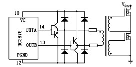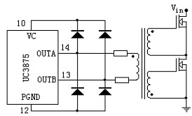 圖中,UC3875提供了四個輸出電流峰值為2A的圖騰柱輸出極,由于它們直接驅動的是變壓器,必須給每個輸出端與電源和地線之間接一個肖特基二極管,以防止損壞輸出端。變壓器次級經過一個電阻后直接接到開關管的觸發極,電阻的作用是抑制脈沖變壓器的漏感和開關管的柵極電容引起的的震蕩。但是要驅動功率較大的MOSFET和IGBT,上述控制芯片的驅動能力就顯得不夠了,此時可以將控制芯片的驅動信號加以推拉式功率放大,如圖2所示: