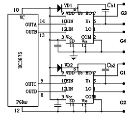 圖中充電二極管VD1、VD2的耐壓值必須高于總線峰值電壓,應采用功耗較小的快恢復整流二極管。自舉電容Cb1、Cb2的選取取決于開關頻率、負載周期及開關管柵極充電需要,應考慮如下幾點:(1)PWM開關頻率高,電容值應選小。