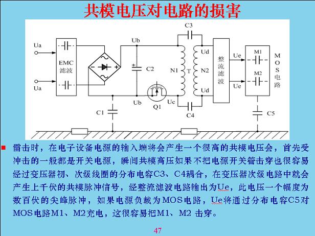 下面講一下共模電壓對電路的損害。其實共模電壓對開關電容前面的影響不是很大,最大是后面一點,通過電壓器分布電路,以前的模式電路電壓用得很低,都是1v-5v左右,納米級容易擊穿,電容也相當小。從里面串進去的電壓經過濾波不斷的吸收降下來,一般有上千伏,容易把后面的擊穿。在實踐過程中為了防雷,這幾個位置最好在上面布一個雷點電容,對防雷電擊穿很有效。共模電壓進去以后瞬間擊穿,如果電子沒斷開,外面的電流會繼續延續下去把它燒掉,如果備一個電容上去,共模電容通過電容一下子把它吸收掉,讓幾個電容互相通電位,幾個模組不會那么容易擊穿。