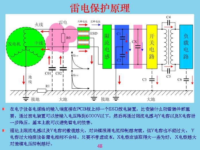 大家想想看,跟前面我們所說的,感應雷這個東西沒有一個標準的概念說什么叫做感應雷。只要打雷的話,外面打雷,窗戶上面的金屬,如果夜間都可以看到放電產生火花,這就是通過電磁感應產生的位移電流原理。從原理上來說,三相四線或三相五線,發電機有中線接地,設備使用者的外殼接地是最有效的避雷方法,但現在很多設備都不接地,沒有辦法接,只有很貴重的進口設備用三相電源,中間那一條地線,地線不是中線,大家要搞清楚。中線雖然是接地的,但在這里不能當成地線,地線一定是自己大樓本身的地,而且要量好接地的地線。因為地線接進去以后,大樓對外面的電磁層進行屏蔽了,大樓相對來說也是導電的,就算不導電,現在國家都有安全要求,大樓超過多少層都要加上避雷針,就是防雷的。如果不能接地,你就要考慮充放電的問題。前面最好的共模電容我覺得還是要,我認為這個共模電容最好連接上,不能接大地,要接在外殼上,接到外殼上有什么好處?共模電壓一進來,雖然電流沒有通過地放電回路,把電壓舉高起來了,與外面輸入電壓是一樣的,外殼電壓取的一樣,起到了屏蔽作用。如果這個接地的話會更加安全,但是地線要足夠粗,回路也足夠,因為放電的電流很大,很容易燒掉。這幾個東西是經過很多年的試驗,8是很成熟的東西,不管做共模還是防雷都要做上,如果連機殼都沒有,只是塑料殼,也要考慮這根線接到什么位置最好?是接到里面面積最大的地方,就是公共地面積最大的地方,讓電位舉起來,其他電位差不會產生很大的電容回路。主要是考慮充放電回路,電流越小越好,兩個電位差越小越好。