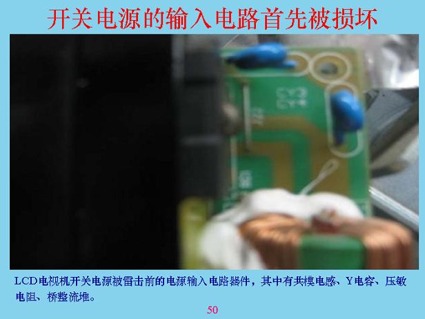 下面我們講一些具體的。這是一個開關電源,開關電源被雷劈的時候,輸入回路基本上都燒了,假如沒燒是什么樣的?可以看看,這是橋堆,這兩個是Y電容,這里面還有一個壓敏電阻。這是共模線圈,雷劈以后全部燒了,說明壓敏電阻沒有起到什么保護作用,兩個電容都燒了,說明電感相當、相當地高。為了防止雷電,首先前面一定要加一個能量吸收,比較大的東西,成本相對來說比較低,像試驗站里面的放電裝置,那個東西沒有地方裝,也貴得很。在硬紙板上面排幾個鋸齒,中間隔一個頭就行了。如果中間隔6mm也可以。有一個一級電感,電感可以使瞬間上去很快的電壓降下來,突然加一個1萬伏、10萬伏,加上去只有這兩端,另外兩端建立不起來,所以剛加進去的時候對雷電來說,大部分能量都被吸收掉了。后面經過這個以后,剩余部分通過共膜電容繼續吸收,吸收完以后還有差模部分,產生的差模部分通過電容把差模吸收掉。共模電容和差模電容具有抑制傳導干擾的作用,對雷電也有抑制作用,所以很多人也在問,電容接到前面好還是接在后面好?這個東西看你有什么作用,如果只是為了防EMI電磁干擾的話,接在越前面越好,接在測試儀表的輸入端最好,接到那里把信號全部短路掉了,就看不到了。但是對于雷電,你接到后面要好很多,所以這主要是防雷的,你就不要考慮電磁干擾和EMC了,盡量把兩個放在后面。