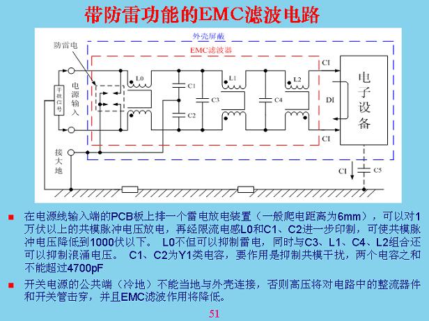 按照道理EMI是電磁干擾,避雷元器件按照道理并不聯系在一起,但EMC濾波里面,與EMC濾波器同樣有防雷功能,就是前面的幾個電感和共模電容還有差模電容對防雷都起到作用,大家要理解,EMC濾波是用于設備上的,但反過來考慮雷電的時候,你就要把干擾信號從外面輸進來,要這樣考慮了,不能單方面,最好在防雷加上一個放電裝置加在電感后面,共用共模濾波電容。