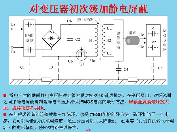 對于一些比較貴重的儀器、設備,在開關電容電壓器這里最好做靜電比例,在初次級線圈中間做一個鋁箔片都可以,包一層,這層不能短路,短路的話變壓器就會燒掉,包在外面可以短路,包在里面不能短路,包在外面吸收漏電電感,包在里面的主回路里面會短路,然后把它進行接地,這相當于可以隔離掉。這個有一個教訓,前段時間康佳臺灣裝LCD屏測試,打了一個隔離變壓器,后面就是接測試儀表,每個月都有一臺、兩臺測試儀表損壞,查不出原因,最后讓他們把隔離變壓器的中間屏蔽才好。屏蔽以后,進一步有機會的話,在接頭有連接的地方加一個磁環,讓共模電壓將磁環速度放慢,緩沖一下,讓瞬間能量降低,瞬間能量緩慢一點,慢慢的過,損傷就會少很多。所有電路都可以把它看成一個分布電流,只要某地方電壓電位在改變,對后面都會產生充放電,從這上面理解就知道了,如果哪個地方構成回路,如果有一個高電壓進來一直傳導到后面,最后充電,充電可以理解成分布電容,如果沒有這個也有一個分布電容在里面,把分布電容放在這里,就比較形象地。就像以前的絕緣長效濾管一樣,手一摸沒有造成回路也壞掉了,絕緣的濾管很容易壞,一從里面拿出來,手一摸就壞掉,一個身上面帶正電,或者你作為天線有感應電壓,感應一下來回充放電就壞掉了。