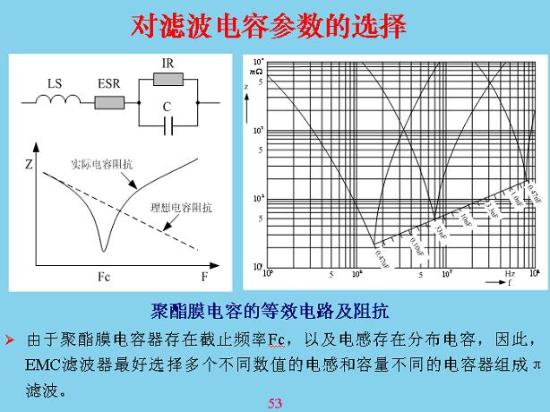 對于濾波電容,大家注意前面的EMC濾波,這個電容不是理想電容,里面有一個電感,還有漏電電阻,里面有串聯電阻,電感和電容有沒有產生串聯諧振?曲線是這樣一條斜線,串聯諧振相當于把信號短路掉了,信號短路的阻礙很大,這里面有一個最佳值,然后成為感線,進行EMC電路設計的時候最好用不同的電容進行配模,這是0.4的曲線,33nF并聯就可以保證在上面不是好的,單獨一個電容后面覆蓋不到,以后有機會我講這些元器件,你們在大學里面學的是符號,對電阻電容基本是不懂的,還有電組電容這方面的問題最多,還有電容,電容來回極化的時候,速度跟不上外面的變化,會損耗相當大,會燒壞,特別是脈壓電容,很多人認為體積越小越好,但沒有考慮在開關上容易出現問題。
