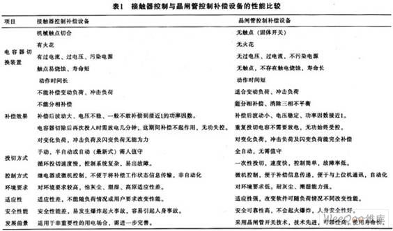 利用接觸器控制補(bǔ)償設(shè)備與用晶閘管控制方法來補(bǔ)償設(shè)備的性能比較如表1所列。
