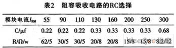 模塊過壓保護(hù)一般也可采用阻容吸收法。對于持續(xù)時(shí)間較短,能量不大的過電壓,一般可在模塊兩端并聯(lián)阻容吸收電路,用吸收電容把過電壓的電磁能量變成靜電能量存貯起來。而用吸收電阻不但可以防止電路振蕩,還可限制晶閘管導(dǎo)通時(shí)電容放電所產(chǎn)生的開通損耗和di/dt值。并聯(lián)在晶閘管開關(guān)模塊的RC值可參考表2。
