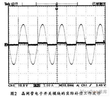 在無功補(bǔ)償實(shí)際應(yīng)用中,可將晶閘管電子開關(guān)模塊用在TSC低壓無功補(bǔ)償以替代接觸器,這樣,就可以在開關(guān)電壓過零時(shí)投入補(bǔ)償電容量,從而避免了沖擊電流的產(chǎn)生和瞬間電網(wǎng)電壓的波動。圖2所示是其工作波形圖。