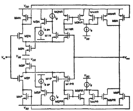 因此,這種緩沖器的工作過程可以這樣詳細(xì)描述如下:當(dāng)輸入信號Vin,在中部電源電壓區(qū),兩個輸入對MIP~M2P和MlN—M2N是有效的,M4P-M5P和M4N--M5N鏡像一個等于IB的電流到輸出支路。而且,電流IB的復(fù)制品通過晶體管MIPR(M1NR)和M2PR—M3PR(MlNR—M2NR)拷貝,給輸出支路底部的附加電路的電流源提供電流。因此,晶體管M4P和M5P(M4N和M5N)關(guān)斷,而且對輸出電流沒有任何貢獻(xiàn)。輸入信號接近VDD時,PMOS輸入對關(guān)斷,而且反相輸入支路的復(fù)制品等等都關(guān)斷。MIPR--M3PR不對輸出支路的附加電路發(fā)送任何電流。這樣的話,M4PR和M5PR導(dǎo)通,從輸出支路吸收等于IB的電流,維持緩沖器是導(dǎo)通的。當(dāng)輸入信號Vin接近VSS時,類似的情況也會發(fā)生。