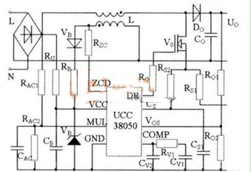 功率因數校正電路原理如圖4所示。電路中,電感L、功率MOS開關管Vo、二極管Do和電容Co組成Boost變換器。電阻分壓器RAc1和RAc2對輸入電壓波形取樣,獲得輸入電壓前饋信號,作為控制芯片UCC38050內部乘法器的一個輸入,與電源反饋信號一起生成電感電流參考信號。電阻Rzc將電感電流過零信號輸入芯片,以控制開關管零電流開通。電阻Rs1檢測開關管電流,輸出電壓經Ro1和Ro2分壓后反饋給芯片。這些信號輸入芯片后,經過UCC38050內部運算與控制,形成PWM控制信號,控制開關管通斷,使電流波形跟蹤電壓波形,實現功率因數校正。