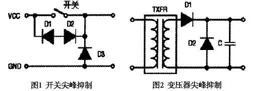 圖1中的二極管用于抑制高壓開關的尖峰電壓。圖2是典型的變壓和整流電路,D2是肖特基或齊納二極管,用于抑制濾波后的尖峰瞬態(tài)噪聲電壓。