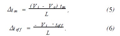 可以認為Δi就是電感線圈中的紋波電流,將導通和關斷狀態時的時間和電壓式(2)和式(3)代入上式,分別寫出導通狀態和關斷狀態時的紋波電流表達式: