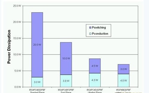 在20kHz下,開關損耗明顯成為總功耗的重要部分。同時,標準速度IGBT的導通損耗雖然最低,但其開關損耗卻最大,并不適合充當高壓側IGBT。