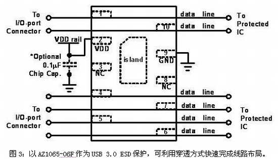 AZ1065系列產品提供了六個極低電容的引腳,可同時保護USB 3.0的兩組差動對(TX和RX)及USB 2.0的差動對(D+和D-),具有減小PCB面積和降低布局復雜度等優點,并可大幅節省系統成本。更特別的是,AZ1065-06F率先采用交錯型的引腳,以便PCB布局時可利用穿透式(Feedthrough)方式實現完美設計,圖3顯示了AZ1065-06F的接線方式。