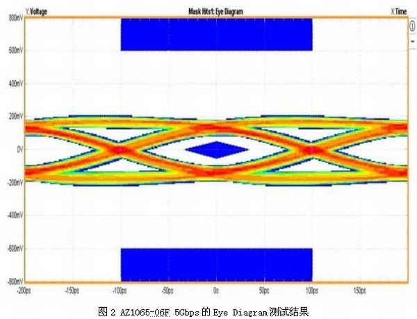 在IEC 61000-4-2接觸模式6kV(TLP電流等效約為17A)的ESD攻擊下,箝制電壓僅有13.4V,足以有效避免系統產品在靜電測試時發生數據錯誤、當機甚至損壞的情況。圖2所示為裝有ESD保護組件AZ1065-06F的USB 3.0端口順利通過5Gbps的眼圖測試結果。