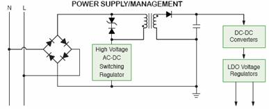 如表1所示,在交流-直流電源轉(zhuǎn)換部分,可以選用安森美半導(dǎo)體的一系列開關(guān)穩(wěn)壓器,如適合低功率應(yīng)用的NCP1010/1/2/3/4自供電單片開關(guān)穩(wěn)壓 器、適合中等功率應(yīng)用的NCP1027高壓單片開關(guān)穩(wěn)壓器,以及高壓門控開關(guān)穩(wěn)壓器NCP1050/1/2/3/4/5等。
