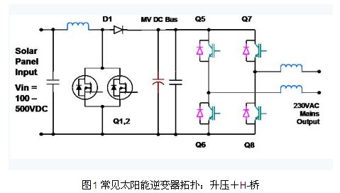 升壓+H-橋拓撲是太陽能逆變器極為常用的拓撲之一,是一種兩級非隔離拓撲。其第一級是升壓級,用于把模塊的可變輸出電壓(例如100V – 500V)升高到更大的中間電壓,后者必須大于實際峰值主線電壓(如230V x sqrt(2),或>325V)。該升壓級還有一個重要作用,就是為了實現(xiàn)效率最大化,太陽能模塊必須運作產(chǎn)生盡可能大的功率,而太陽能模塊的功率 曲線可通過輸出電流乘以輸出電壓數(shù)值獲得。功率特性中有一個最大點,被稱為“最大功率點”或MPP,而這精確位置會隨著模塊的類型、溫度和日照陰影等因素而變化。