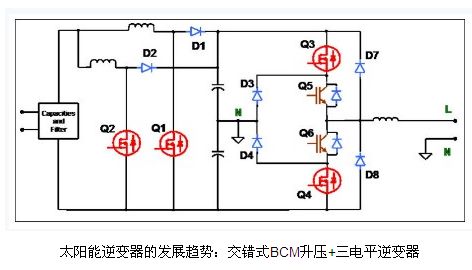 有很多方法能夠提高升壓逆變器的效率。由于升壓逆變器可在連續(xù)傳導(dǎo)模式或邊界傳導(dǎo)模式(CCM 或 BCM)下工作,這就衍生出不同的優(yōu)化方案。在CCM模式中,損耗的一大主因是升壓二極管的反向恢復(fù)電流;在這種情況下,一般使用碳化硅二極管或飛兆半導(dǎo)體的Stealth 二極管來解決。太陽能逆變器更常采用的是BCM模式,而盡管對這類功率級通常建議選擇CCM模式,但采用BCM模式的原因在于BCM模式中二極管的正向電 壓要低得多。而且,BCM模式也具有高得多的EMI濾波器和升壓電感紋波電流。這時,良好的高頻電感設(shè)計是一解決方案。