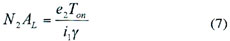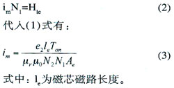 式中:e2為次級感應電壓,Ton為導通時間,N2為次級線圈匝數,Ae為磁芯有效截面積,△B為工作磁感應強度,單位為特斯拉(T)。