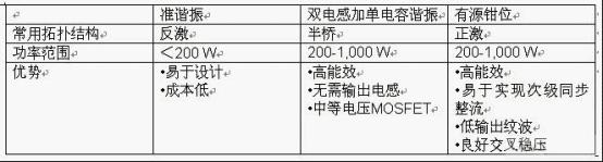 要提高主轉(zhuǎn)換器能效可以采用以下幾種方法。一是通過(guò)降低導(dǎo)通阻抗(開(kāi)關(guān)損耗較高)和/或減小初級(jí)峰值電流和均方根電流來(lái)降低初級(jí)導(dǎo)通損耗;二是考慮采用軟開(kāi)關(guān)技術(shù)降低開(kāi)關(guān)損耗;三是通過(guò)減少整流器壓降(使用低正向壓降二極管或FET整流器)來(lái)降低次級(jí)損耗;四是采用更好的磁芯材料來(lái)降低磁芯損耗。表1列出了主要軟開(kāi)關(guān)的拓?fù)浣Y(jié)構(gòu),可供設(shè)計(jì)時(shí)參考。