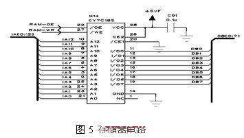 通過軟件參與設(shè)置,很容易得到全頻段內(nèi)的預(yù)置誤差數(shù)據(jù)。對于2-20GHz的微波振蕩器,如果每隔5MHz設(shè)置補(bǔ)償一個點(diǎn),那么存儲器至少需要3600個地址空間,在此選擇8k×8靜態(tài)存儲器芯片,存儲空間滿足要求。在時(shí)鐘的同步控制下,地址生成器產(chǎn)生對應(yīng)地址,該系列數(shù)據(jù)被存入RAM中,電路如圖5所示。