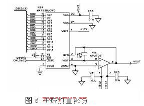 在主振預(yù)置電路D/A部分,為了照顧2-20GHz全頻段能有較為精細(xì)的預(yù)置分辨率,并且滿足△Data插值需要,在此選擇了14位D/A轉(zhuǎn)換器,使用時(shí)在數(shù)據(jù)范圍0~16383兩端預(yù)留一定的插值空間,電路如圖6所示。
