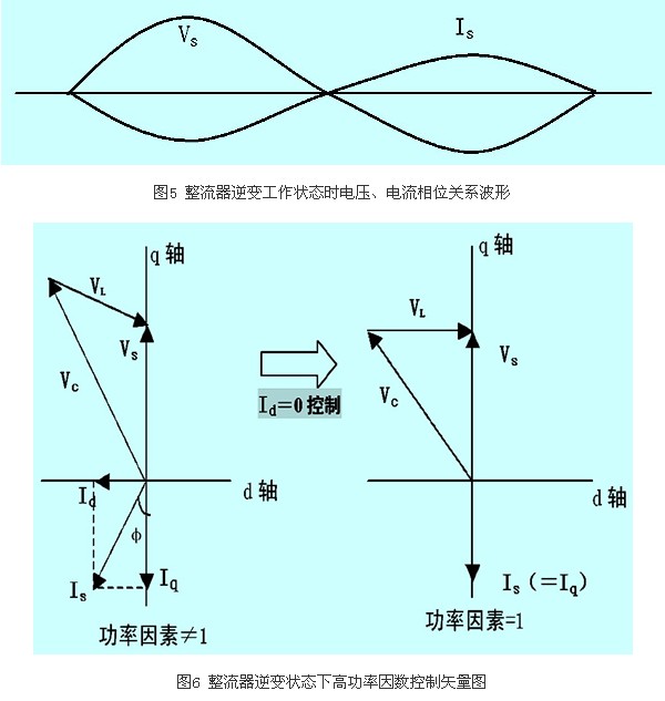 我們希望整流器不論是工作在整流狀態還是逆變狀態其功率因素都等于1.0,因此整流器工作在逆變狀態時,只要做到is與vs的相位是反相的,功率因數同樣可控制在1.0,這時能量是往電網方向流動的。如圖5和圖6所示。
