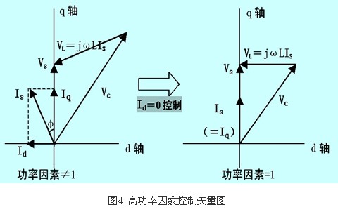 根據圖4可以知道,要把整流器的功率因數控制在1.0的話,只要把無功電流設定值設為0(id﹡=0),通過整流器控制系統調節改變輸出電壓vc的大小和相位,使實際無功電流分量id=0,那么is=iq+id=iq,is就能與vs保持在同相位,功率因數控制到了1.0。