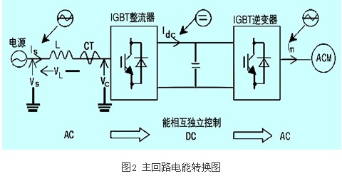 鑒于整流器和逆變器相互之間是分別獨立運行的,它們是分別獨立可控的,能對整流器的功率因數進行獨立控制,而不受馬達負荷及運轉速度的影響,如圖2所示。