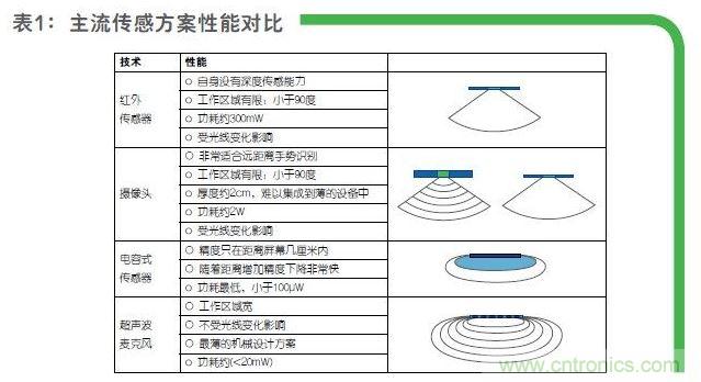 在數字超聲波麥克風出現后,由于對環境光線沒要求(黑暗中也能精準感測)、很容易測得距離/景深等特殊性能,有先見的系統公司紛紛采用該技術實現一些特有的手勢識別、距離感應等應用。Khamharn指出超聲波的方案性能相對更穩定且成本更低,特地為大家對比了超聲波麥克風和目前主流傳感器的性能對比,如表一所示。
