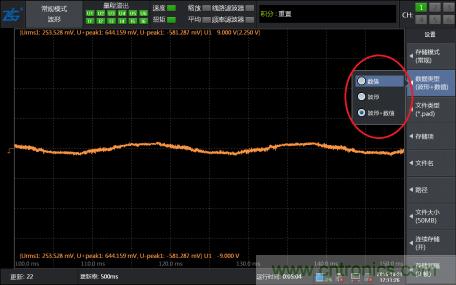 第四步,找到了想要觀察的波形幀之后,可以通過“FORM按鍵調(diào)整界面的窗口時間,對波形進(jìn)行任意放大或縮小”并可以調(diào)出光標(biāo)測量任意兩點的橫縱軸數(shù)據(jù)。看到這里我相信大部分人已經(jīng)可以找到自己想要看的波形了。但是想要把波形存儲記錄下來怎么辦,而且想要長時間記錄可以實現(xiàn)嗎?不要急,PA功率分析儀還提供波形保存記錄功能。