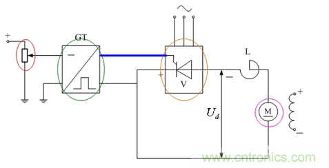 改變GT的輸入信號(圖2中的紅色圈顯現)大小,就可改變其輸出脈沖(圖2中的藍色線條顯現)的相位,不同相位的脈沖輸入整流器V,可以使整流器的輸出電壓Ud的大小發生變化,進而改變電動機M的轉速。