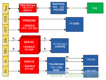 您可將TPD2S300與其他保護裝置(如TPD1S514(過壓+沖擊+VBUS的ESD保護)和ESD122 (雙通道低電容ESD保護))配對,為USB Type-C連接器提供一體式解決方案(圖2)。