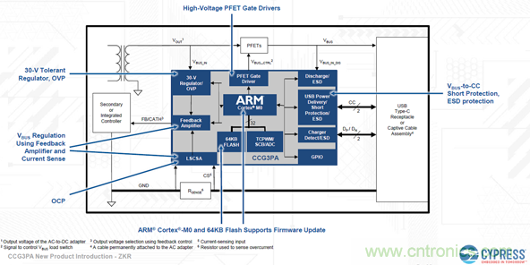 如圖2所示,CCG3PA具有高集成度,與通過使用分立組件實現的功能等效系統相比,具有組件數量更少、電路板占位面積更小、電路板布局更簡單以及材料成本和PCB成本更低的優勢。
