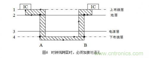 在布線時盡量少穿過孔,因?yàn)檫^孔阻抗和線阻抗不一樣,存在阻抗突變,從而產(chǎn)生駐波使信號變壞,容易形成輻射,尤其是在時鐘需要穿層時,要做技術(shù)處理,時鐘線跨層時的處理如圖6所示。