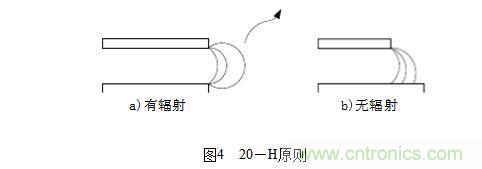 (1)20-H原則,決定印制線條間的距離,表述如下:所有的具有一定電壓的PCB都會向空間輻射電磁能量(如圖4a),為減小這個效應(yīng),PCB的物理尺寸都應(yīng)該比最靠近的接地板的物理尺寸小20H(其中H是兩層PCB的間距),即3mm左右,這樣可使輻射強(qiáng)度下降70%(如圖4b)。20-H原則示意圖如圖4所示: