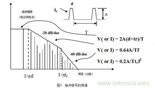 在EMC中,除了基本頻率外,還需考慮諧波因素,通常取十倍頻,但在數(shù)字電路中卻有些不同,比如在時鐘電路和邏輯門電路中,輻射帶寬與數(shù)字信號的上升沿或下降沿有關(guān)系,而不是數(shù)字信號的重復(fù)周期,其關(guān)系為:rtF?/1max?,其中rt是脈沖的上升沿時間。例如,典型時鐘驅(qū)動的邊沿速率是2ns,此時,maxF≈160MHz,再考慮十倍頻,則此時鐘電路可能產(chǎn)生直到1.6GHz的輻射帶寬。所以在選擇器件時要選擇慢速的邏輯器件系列,因?yàn)槠骷﹄姶泡椛湄暙I(xiàn)的大小與工作頻率無直接關(guān)系而只取決于邊沿速率(這和從電路功能設(shè)計(jì)上選擇快速器件是矛盾的,在電路設(shè)計(jì)時需要折中考慮)。還有從器件的抗擾能力上來說,CMOS器件是最好的,因?yàn)樗脑肼暼菹薷摺姆庋b上來說,BGA是最好的,因?yàn)樗囊€很短。脈沖信號的頻譜如圖3所示。