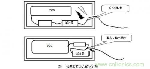 (3)在電源電路(尤其是開關(guān)電源中),操縱電路,控制電路,以及轉(zhuǎn)換電路中消除產(chǎn)生的干擾。在工程實(shí)際中,一個最值得注意的地方是電源濾波器的安裝,常見的濾波器的錯誤安裝如圖2所示。