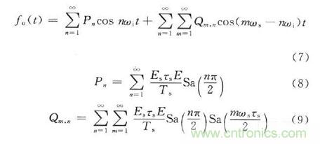 式中:E,ωi分別為輸入信號(hào)的幅度和角頻率。設(shè)采樣脈沖信號(hào)為fs(t),采樣后的信號(hào)為fo(t),則采樣過(guò)程在時(shí)域上的數(shù)學(xué)表示式為fo(t)=fi(t)fs(t),在DRFM中采用等間隔均勻采樣,采樣周期為Ts,采樣時(shí)鐘頻率ωs=2πfs。在實(shí)際電路中,采樣是在采樣脈沖上升的瞬間完成的。因此采樣脈沖的寬度可以看成一個(gè)窄脈寬,用τs。來(lái)表示。采樣脈沖的傅里葉級(jí)數(shù)為: