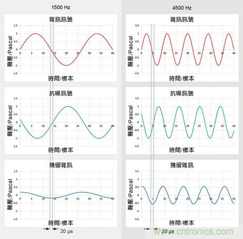 前饋降噪帶寬,在低頻處被耳機驅動模塊限制在50Hz左右,在高頻處被聲學結構和訊號處理延遲限制于3kHz。延遲會導致難以在抗噪訊號和噪聲訊號之間實現180度的相位反轉,高頻部份因為波長較短更難處理。圖2顯示了兩種頻率下20μs延遲對降噪效果的影響:頻率為1500Hz時,殘余噪聲約剩1/5(14dB ANC),但頻率為4500Hz時,即使延遲不變,殘余噪聲也已增加到3/5(僅4dB ANC)。